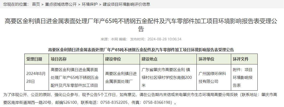 8月28日,肇慶市高要區金利鎮日進金屬表面處理廠年產65噸不銹鋼五金配件及汽車零部件加工項目環境影響報告表獲受理公告,公告期:5個工作日。