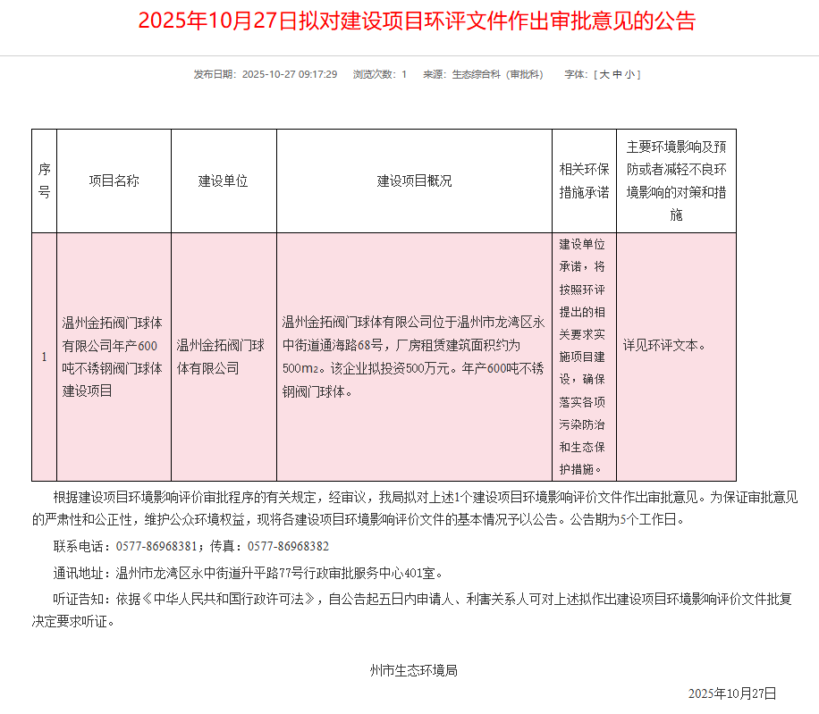2025年10月27日,溫州市生態(tài)環(huán)境局就溫州金拓閥門(mén)球體有限公司年產(chǎn)600噸不銹鋼閥門(mén)球體建設(shè)項(xiàng)目環(huán)境影響報(bào)告表作出審批意見(jiàn)并對(duì)外進(jìn)行公告,公告期:5個(gè)工作日。