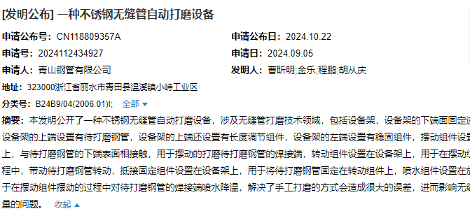 2024年10月22日,青山鋼管有限公司成功申請一項名為“一種不銹鋼無縫管自動打磨設備”專利,申請公布號為CN118809357A,申請日期為2024年9月5日。